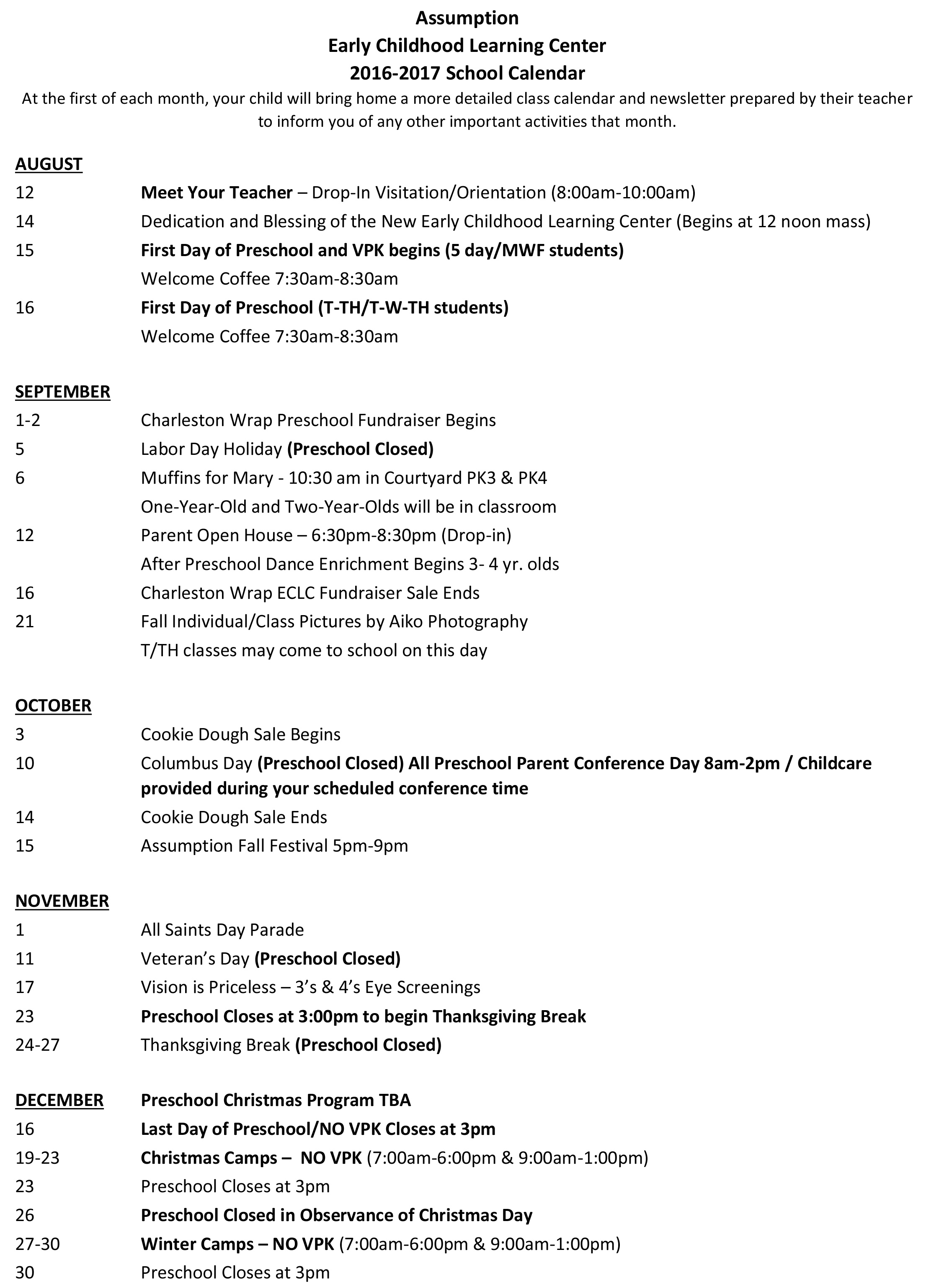 ECLC School Calendar 2016-2017